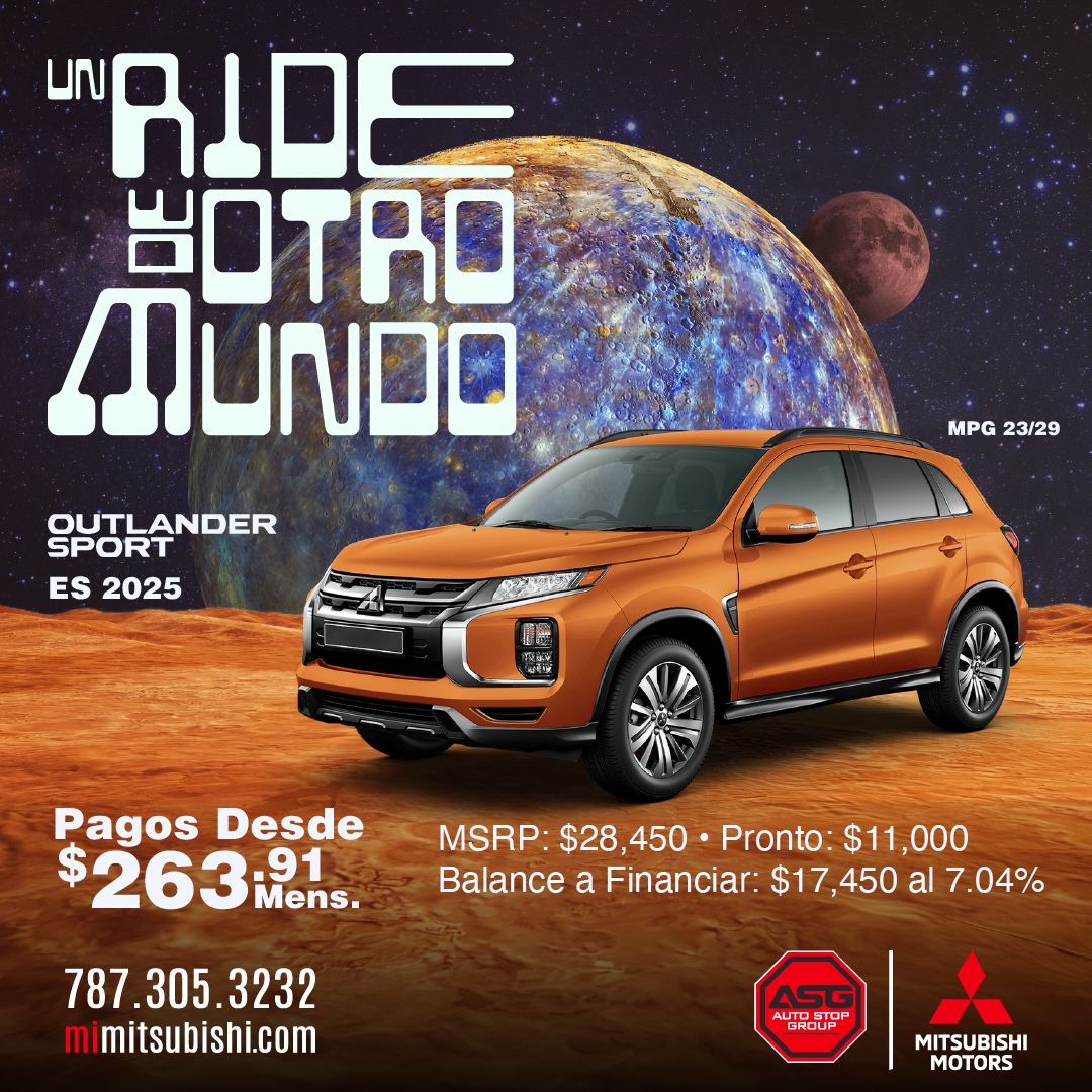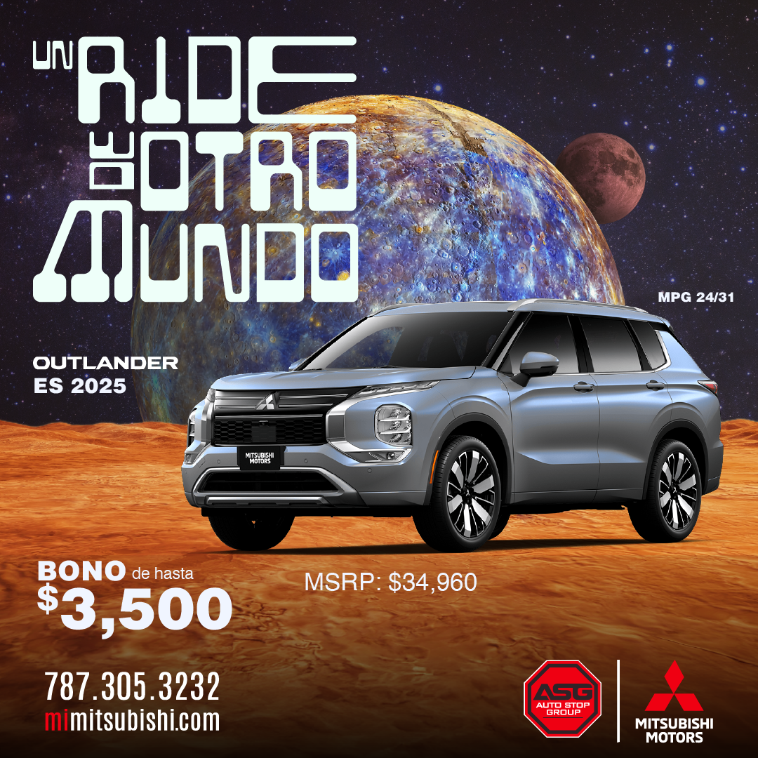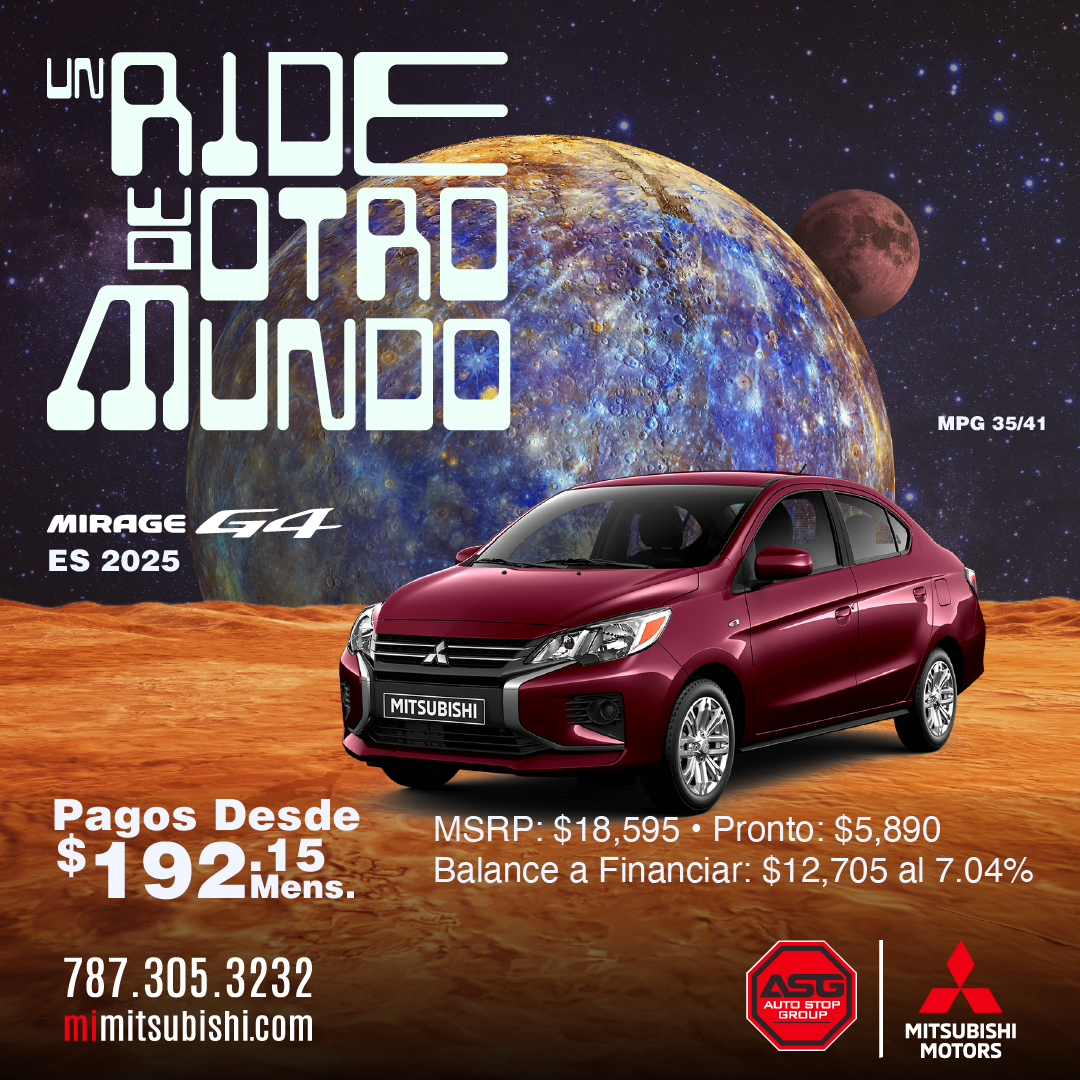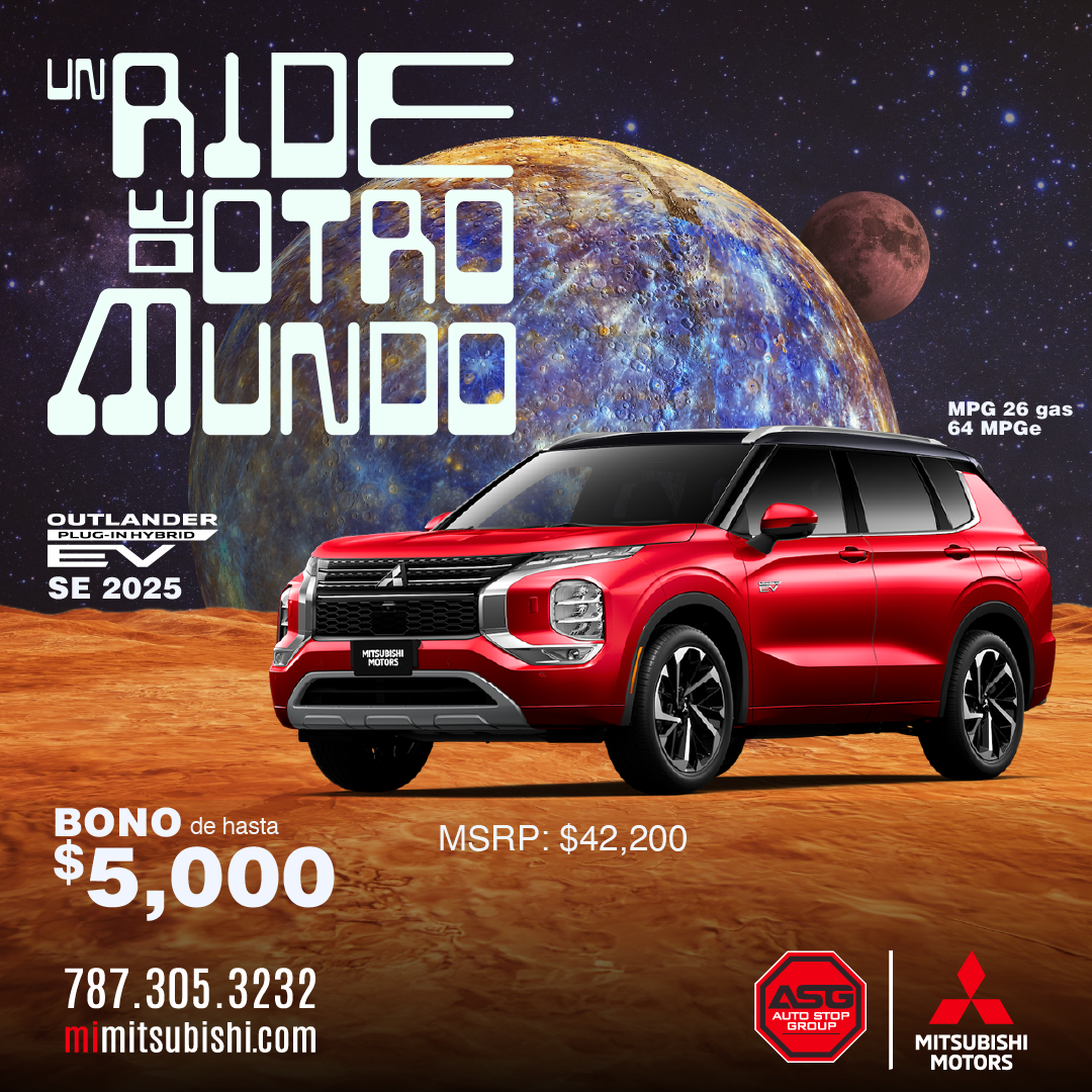 (M) Mirage 2025; Ejemplo de pago aplica a modelo ES/B42 MSRP $17,995 ; Pronto aportado por cliente $5,290; balance a financiar $12,705; 84 pagos de $192.15 al 7.04% (APR). (G4) Mirage G4 2025. Ejemplo de pago aplica a modelo ES/B42 MSRP $18,595 ; Pronto aportado por cliente $5,890; balance a financiar $12,705; 84 pagos de $192.15 al 7.04% (APR). (OS) Outlander Sport 2025 ES/B42 MSRP $28,450; Pronto aportado por cliente $11,000; balance a financiar $17,450; 84 pagos de $263.91 al 7.04% (APR). (O) Outlander 2025; Modelo ES/B52 ; MSRP $34,9605; Bono $3,500 . (OP) Outlander PHEV 2025; Modelo SE/B51 MSRP $42,200; Bono hasta $5,000 (EC) Eclipse Cross 2026 Modelo ES/B52 MSRP $29,200; Desde 2.99% APR 10 años/100,000 millas Garantía del Tren Propulsor solamente aplica a los dueños originales de vehículos Mitsubishi nuevos. Financiamiento ofrecido por Popular Auto, LLC. Sujeto a aprobación de crédito para clientes con puntuación de crédito de 720 en adelante. Ciertas restricciones aplican. Ofertas no se pueden combinar. Oferta 0 Pagos por 3 meses para préstamo de auto convencional al acogerse a pago directo. No requiere que el cliente realice pagos por 3 meses siempre y cuando el contrato se haya comprado en o antes del 1 al 31 de octubre del 2025, esto no representa una condonación de intereses. Oferta de programa de mantenimiento limitado (básico) incluído por 2 años aplica a los modelos Outlander 2025. Todas las ofertas son exclusivas para clientes que adquieran un contrato de servicio y financiamiento según cada oferta y no son transferibles. Ejemplos no contemplan, seguros, gastos de registro, ACAA, tablilla ni seguro de responsabilidad obligatorio. Solo aplica para clientes con crédito excelente y score (EMP) 795 en adelante. Sujeto a aprobación de crédito. Ciertos términos y condiciones aplican. Otras tasas aplican a otras experiencias de crédito, según los parámetros y criterios establecidos por Popular Auto. Financiamiento ofrecido por Popular Auto, LLC y Oriental Bank. Sujeto a aprobación de crédito. Ciertas restricciones aplican. Más detalles en los dealers. Ofertas válidas del 1 al 31 de octubre de 2025 o mientras duren las unidades.