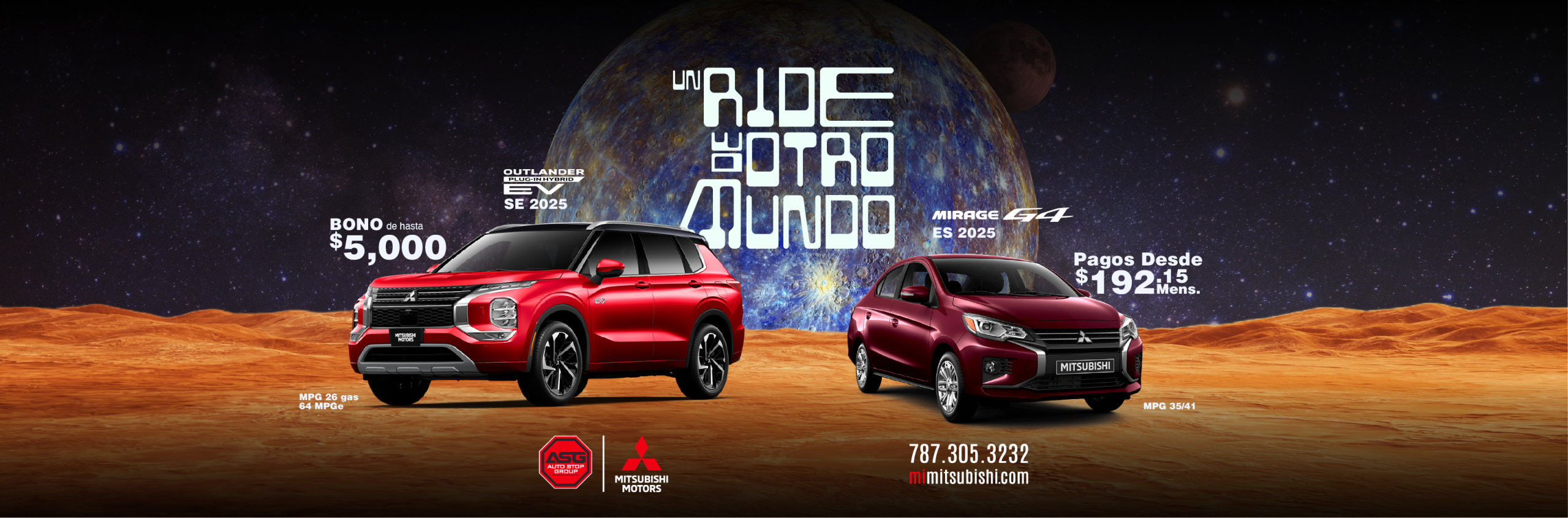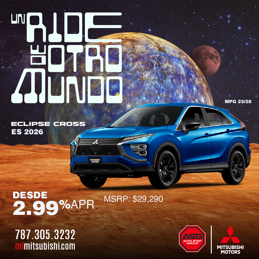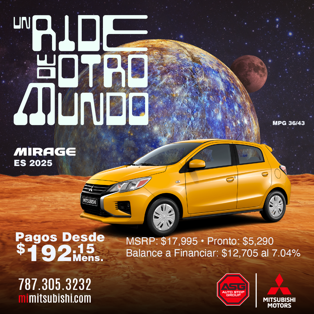 (M) Mirage 2025; Ejemplo de pago aplica a modelo ES/B42 MSRP $17,995 ; Pronto aportado por cliente $5,290; balance a financiar $12,705; 84 pagos de $192.15 al 7.04% (APR). (G4) Mirage G4 2025. Ejemplo de pago aplica a modelo ES/B42 MSRP $18,595 ; Pronto aportado por cliente $5,890; balance a financiar $12,705; 84 pagos de $192.15 al 7.04% (APR). (OS) Outlander Sport 2025 ES/B42 MSRP $28,450; Pronto aportado por cliente $11,000; balance a financiar $17,450; 84 pagos de $263.91 al 7.04% (APR). (O) Outlander 2025; Modelo ES/B52 ; MSRP $34,9605; Bono $3,500 . (OP) Outlander PHEV 2025; Modelo SE/B51 MSRP $42,200; Bono hasta $5,000 (EC) Eclipse Cross 2026 Modelo ES/B52 MSRP $29,200; Desde 2.99% APR 10 años/100,000 millas Garantía del Tren Propulsor solamente aplica a los dueños originales de vehículos Mitsubishi nuevos. Financiamiento ofrecido por Popular Auto, LLC. Sujeto a aprobación de crédito para clientes con puntuación de crédito de 720 en adelante. Ciertas restricciones aplican. Ofertas no se pueden combinar. Oferta 0 Pagos por 3 meses para préstamo de auto convencional al acogerse a pago directo. No requiere que el cliente realice pagos por 3 meses siempre y cuando el contrato se haya comprado en o antes del 1 al 31 de octubre del 2025, esto no representa una condonación de intereses. Oferta de programa de mantenimiento limitado (básico) incluído por 2 años aplica a los modelos Outlander 2025. Todas las ofertas son exclusivas para clientes que adquieran un contrato de servicio y financiamiento según cada oferta y no son transferibles. Ejemplos no contemplan, seguros, gastos de registro, ACAA, tablilla ni seguro de responsabilidad obligatorio. Solo aplica para clientes con crédito excelente y score (EMP) 795 en adelante. Sujeto a aprobación de crédito. Ciertos términos y condiciones aplican. Otras tasas aplican a otras experiencias de crédito, según los parámetros y criterios establecidos por Popular Auto. Financiamiento ofrecido por Popular Auto, LLC y Oriental Bank. Sujeto a aprobación de crédito. Ciertas restricciones aplican. Más detalles en los dealers. Ofertas válidas del 1 al 31 de octubre de 2025 o mientras duren las unidades.