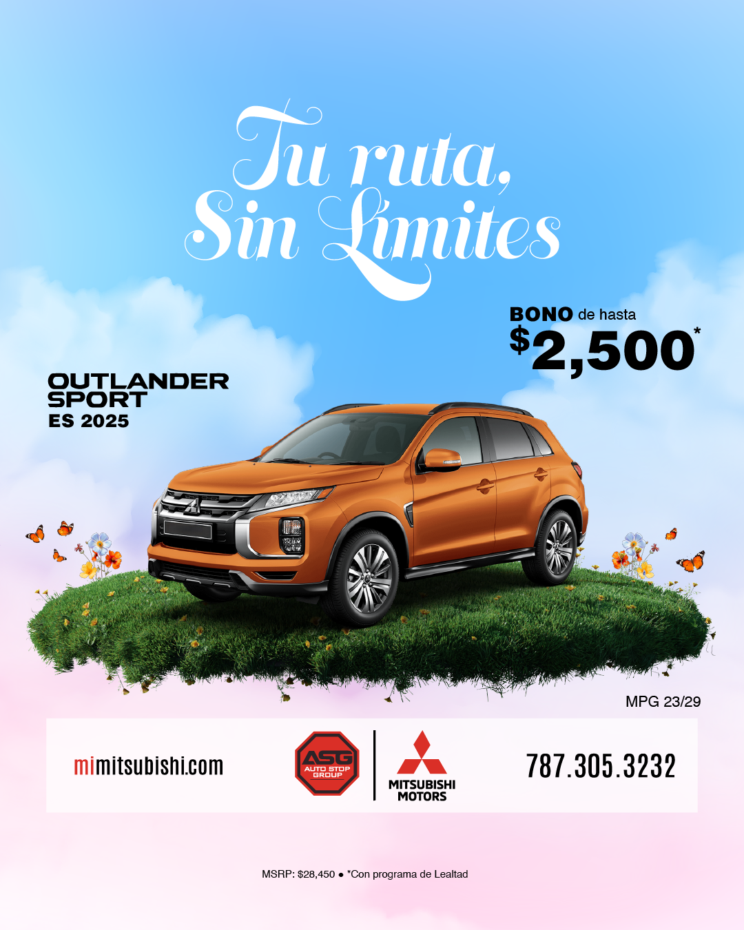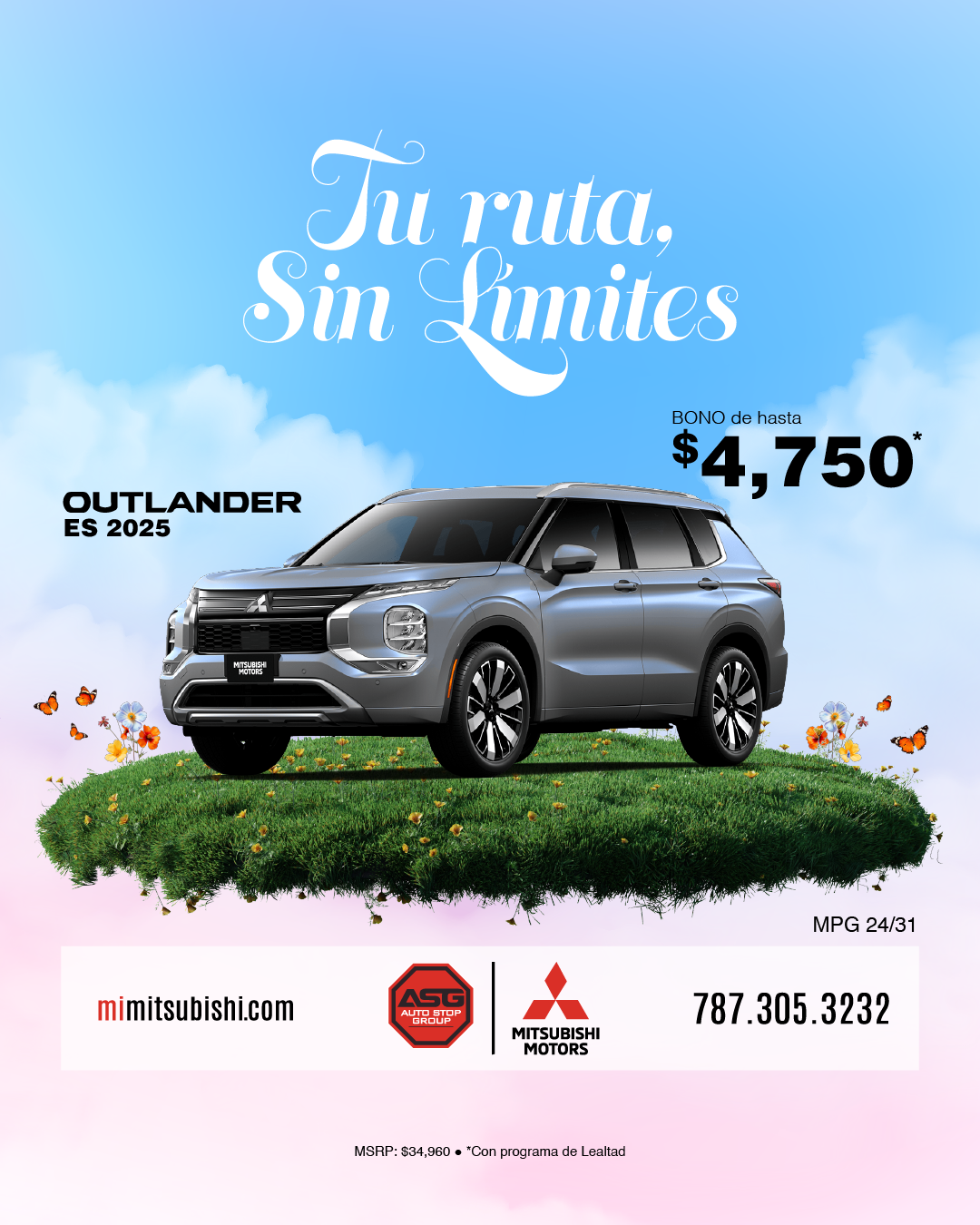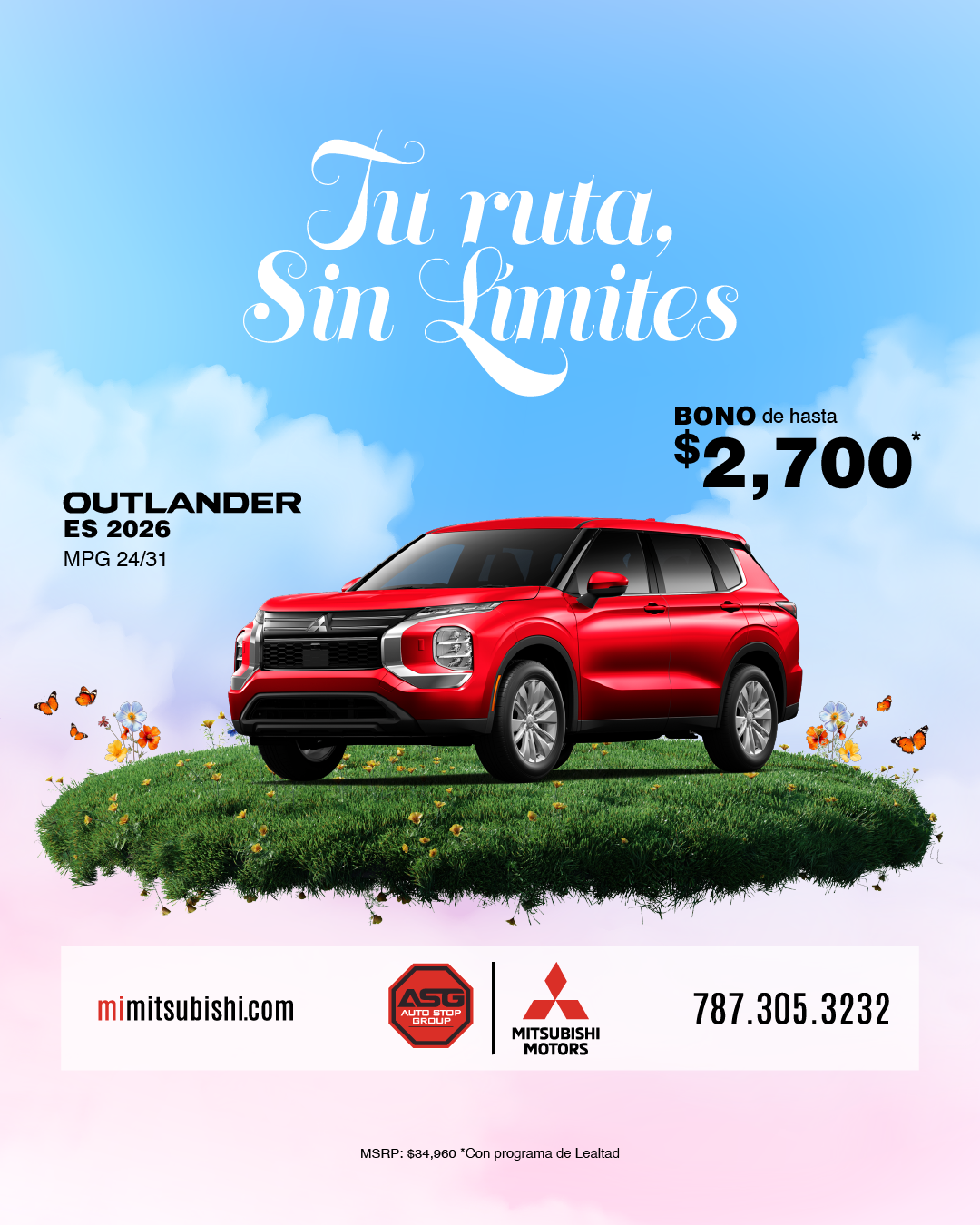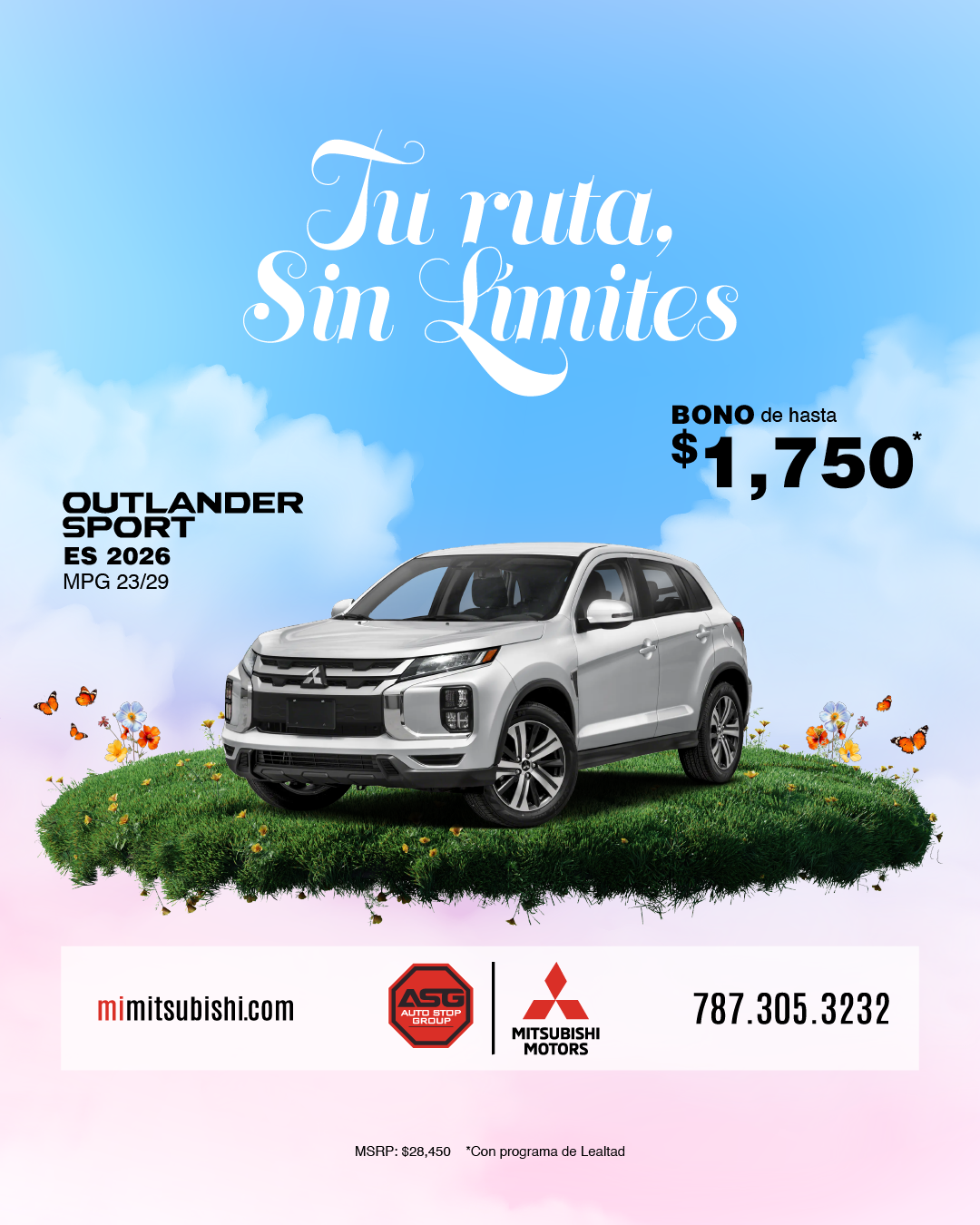 (M) Mirage 2024; modelo ES/B42 MSRP $17,995 ; (G4) Mirage G4 2024. modelo ES/B42 MSRP $18,595; (OS) Outlander Sport 2025 ES/B68 MSRP $28,450; Bono de hasta $2,500 con el programa de Lealtad; (OS) Outlander Sport 2026 ES/B68 MSRP $28,450; Bono de hasta $1,750, con el programa de Lealtad; (O) Outlander 2025; Modelo ES/B52 ; MSRP $34,960; Bono de hasta $4,750 con el programa de Lealtad (OP) Outlander PHEV 2025; Modelo SE/B51 MSRP $44,200; con interés desde 0.% (APR) a 72 meses con el programa de Lealtad (EC) Eclipse Cross 2026 Modelo LE/B52 MSRP $30,695; Bono de hasta $4,500 con el programa lealtad. Sujeto a aprobación de crédito para clientes con puntuación de crédito de 795 en adelante. Ciertas restricciones aplican. Ofertas no se pueden combinar. Oferta -0- Pagos por 3 meses para préstamo de auto convencional al acogerse a pago directo. No requiere que el cliente realice pagos por 3 meses siempre y cuando el contrato se haya comprado en o antes del 7 al 31 de ENERO del 2026, esto no representa una condonación de intereses. Oferta de programa de mantenimiento limitado (básico) incluído por 2 años aplica a los modelos Outlander 2025. Todas las ofertas son exclusivas para clientes que adquieran un contrato de servicio y financiamiento según cada oferta y no son transferibles. Ejemplos no contemplan, seguros, gastos de registro, ACAA, tablilla ni seguro de responsabilidad obligatorio. Solo aplica para clientes con crédito excelente y score (EMP) 795 en adelante. Sujeto a aprobación de crédito. Ciertos términos y condiciones aplican. Otras tasas aplican a otras experiencias de crédito, según los parámetros y criterios establecidos por Popular Auto. Más detalles en los dealers. Más detalles en los dealers. Ofertas válidas del 1 al 30 de abril, 2026 o mientras duren las unidades.