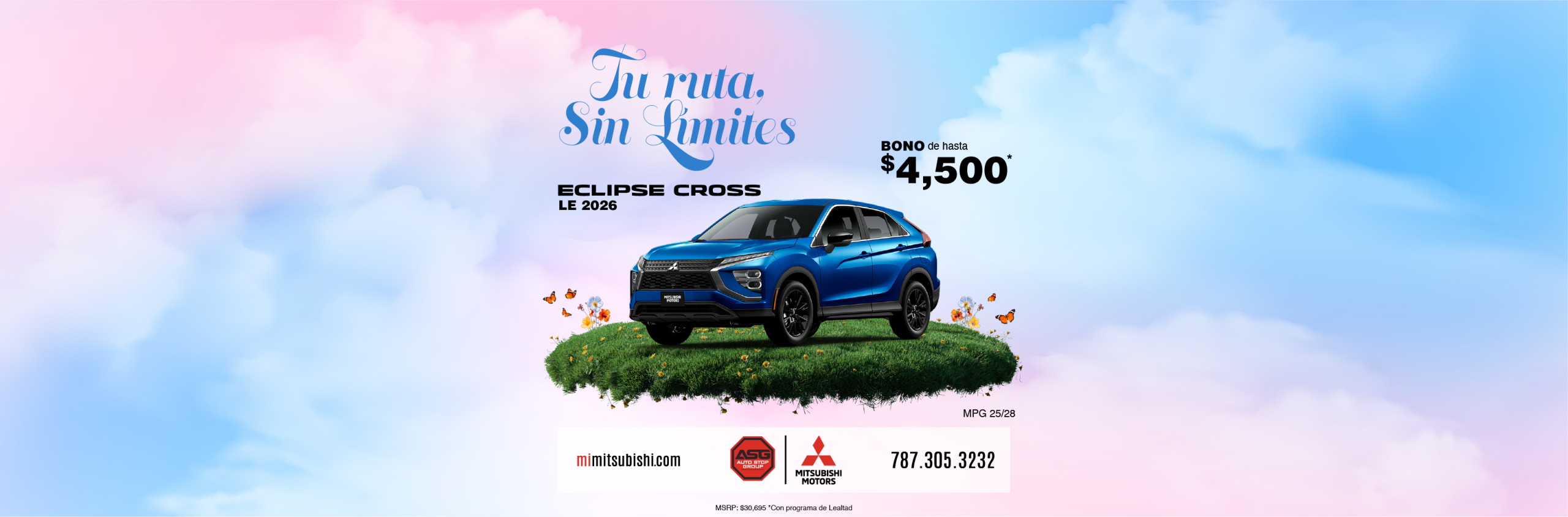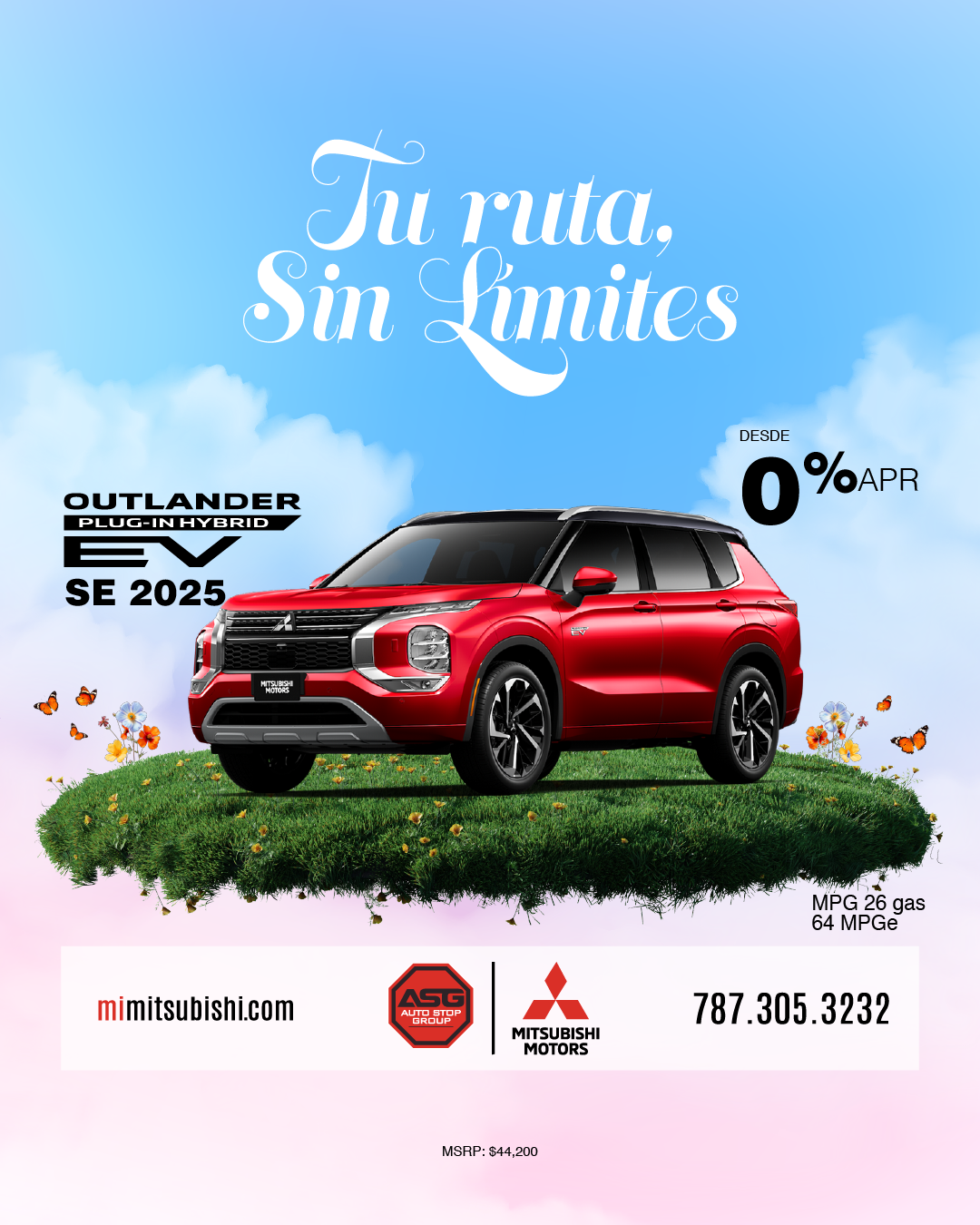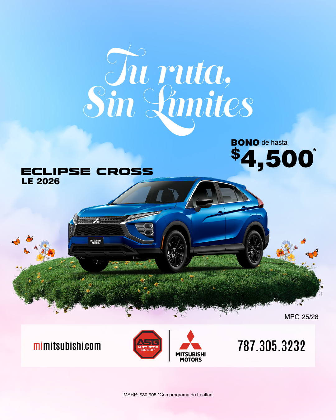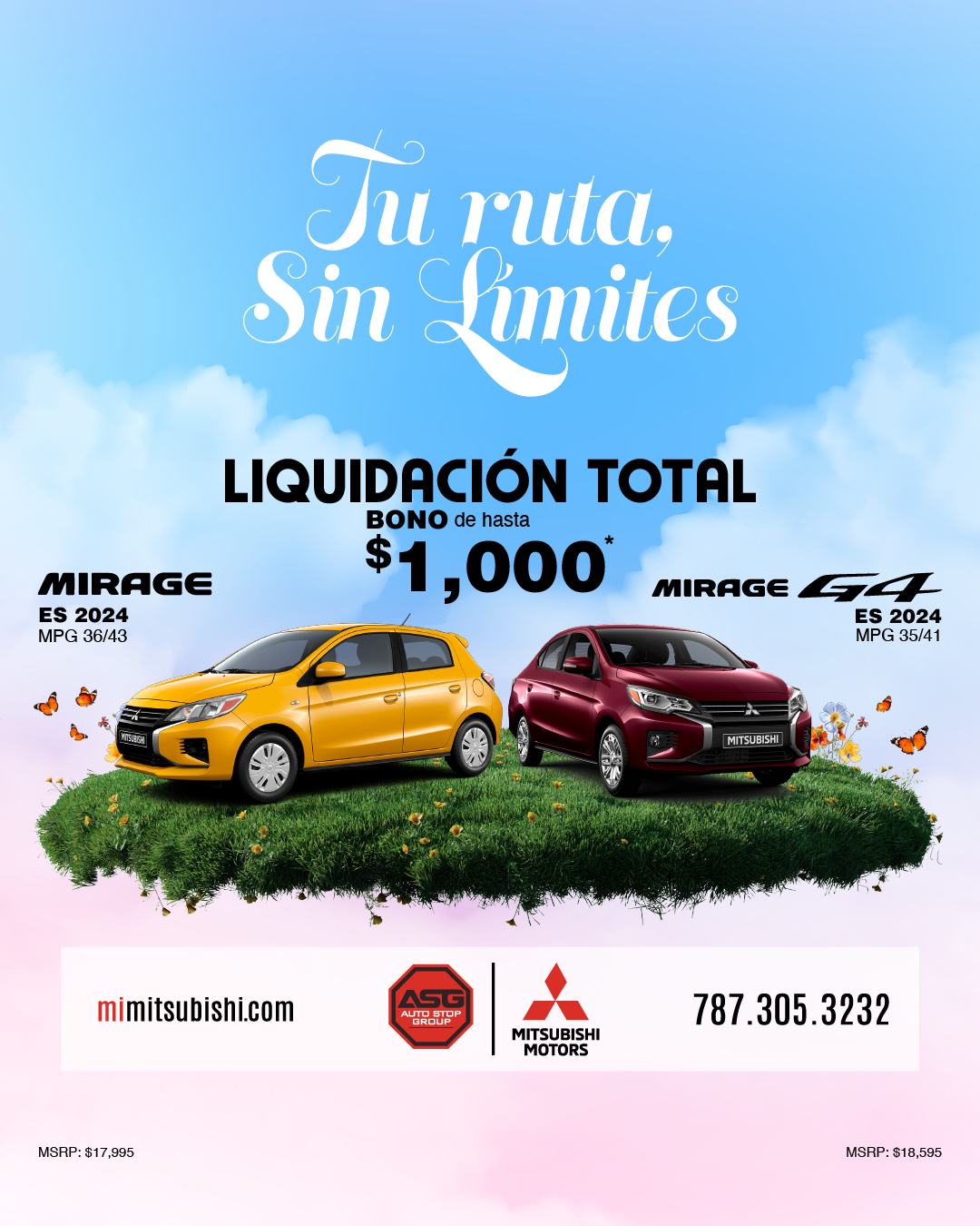 (M) Mirage 2024; modelo ES/B42 MSRP $17,995 ; (G4) Mirage G4 2024. modelo ES/B42 MSRP $18,595; (OS) Outlander Sport 2025 ES/B68 MSRP $28,450; Bono de hasta $2,500 con el programa de Lealtad; (OS) Outlander Sport 2026 ES/B68 MSRP $28,450; Bono de hasta $1,750, con el programa de Lealtad; (O) Outlander 2025; Modelo ES/B52 ; MSRP $34,960; Bono de hasta $4,750 con el programa de Lealtad (OP) Outlander PHEV 2025; Modelo SE/B51 MSRP $44,200; con interés desde 0.% (APR) a 72 meses con el programa de Lealtad (EC) Eclipse Cross 2026 Modelo LE/B52 MSRP $30,695; Bono de hasta $4,500 con el programa lealtad. Sujeto a aprobación de crédito para clientes con puntuación de crédito de 795 en adelante. Ciertas restricciones aplican. Ofertas no se pueden combinar. Oferta -0- Pagos por 3 meses para préstamo de auto convencional al acogerse a pago directo. No requiere que el cliente realice pagos por 3 meses siempre y cuando el contrato se haya comprado en o antes del 7 al 31 de ENERO del 2026, esto no representa una condonación de intereses. Oferta de programa de mantenimiento limitado (básico) incluído por 2 años aplica a los modelos Outlander 2025. Todas las ofertas son exclusivas para clientes que adquieran un contrato de servicio y financiamiento según cada oferta y no son transferibles. Ejemplos no contemplan, seguros, gastos de registro, ACAA, tablilla ni seguro de responsabilidad obligatorio. Solo aplica para clientes con crédito excelente y score (EMP) 795 en adelante. Sujeto a aprobación de crédito. Ciertos términos y condiciones aplican. Otras tasas aplican a otras experiencias de crédito, según los parámetros y criterios establecidos por Popular Auto. Más detalles en los dealers. Más detalles en los dealers. Ofertas válidas del 1 al 30 de abril, 2026 o mientras duren las unidades.